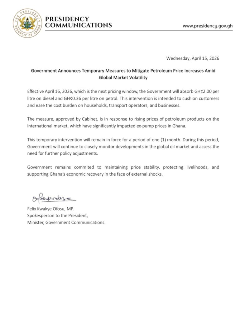 “Effective April 16, 2026, which is the next pricing window, the Government will absorb GH¢2 per litre on diesel and GH¢0.36 per litre on petrol.