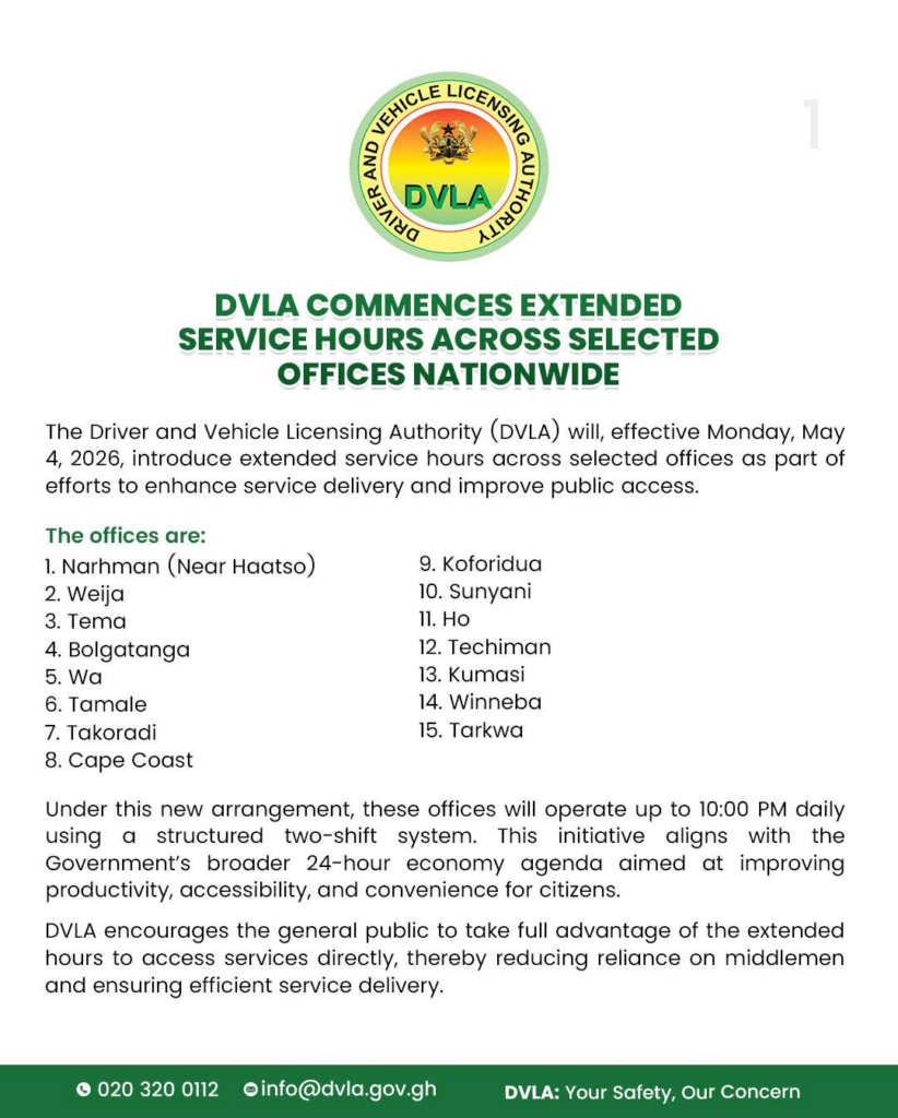 The Driver and Vehicle Licensing Authority (DVLA) has announced the introduction of extended service hours across selected offices nationwide, in a move aimed at improving service delivery and expanding public access. The new arrangement is set to take effect from Monday, May 4, 2026.