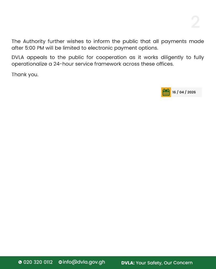 However, the DVLA has clarified that all payments made after 5:00 pm will be restricted to electronic payment methods. This includes mobile money, debit/credit cards, and other digital payment platforms approved by the Authority.
